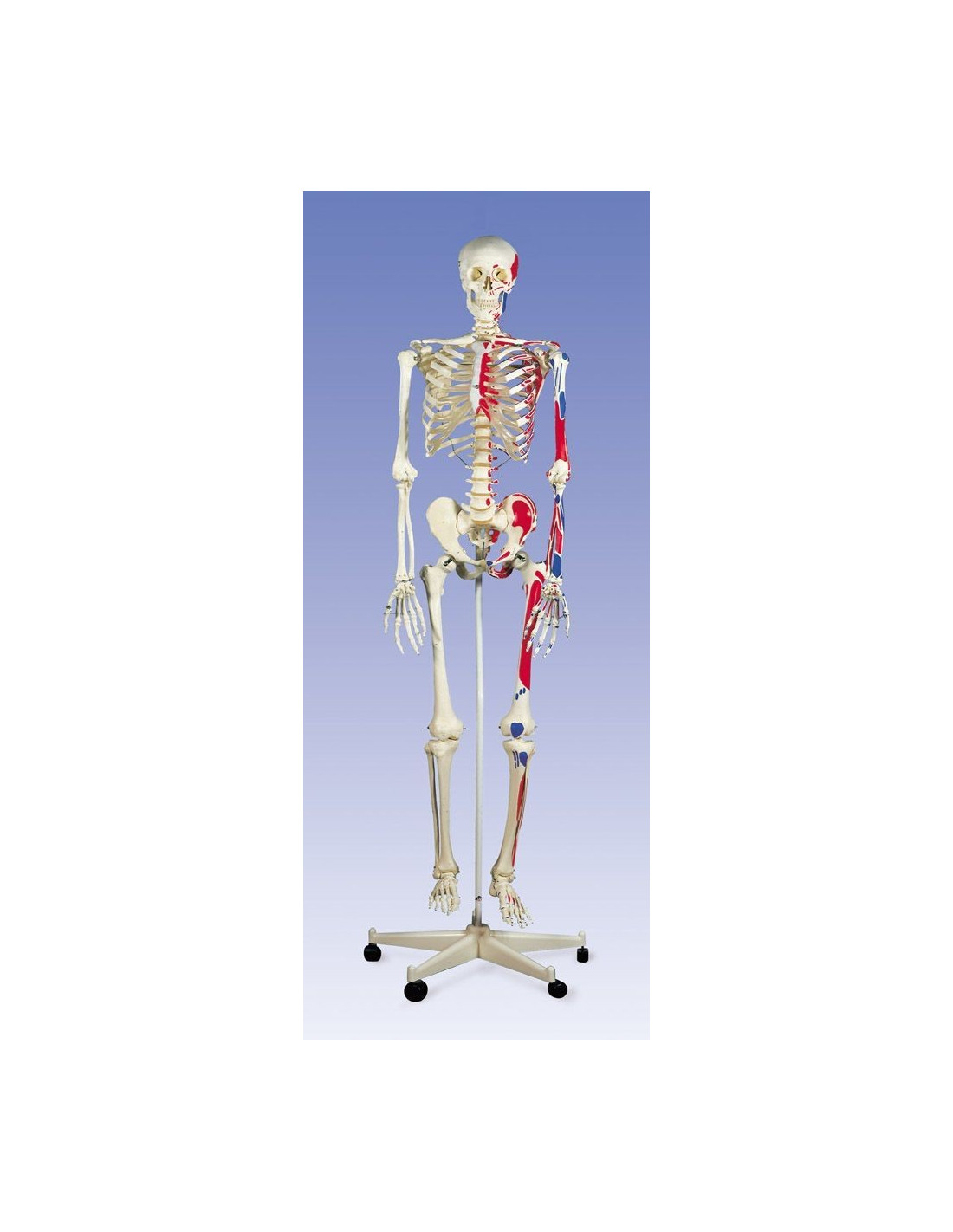 Model kostura prikazuje strukturnu interakciju između kostiju i mišića. Na lijevoj strani kostura prikazano je preko 600 važnih medicinskih i anatomskih struktura, poput polazišta mišića (crveno) i mjesta pričvršćivanja (plavo), kao i ručno numerirane kosti, fisure i foramine na desnoj strani.
