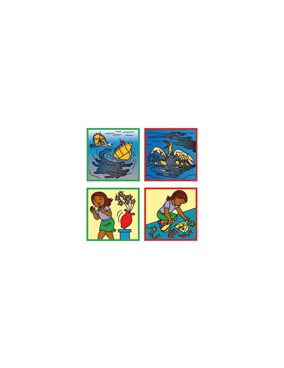 Ove kartice prikazuju uzrok i posljedicu nekoga događaja. Npr. što se dogodi ako srušite vazu s cvijećem? Vaza će pasti na pod i razbiti se! Kartice je potrebno uzročno-posljedičnim vezama povezati u parove. Djeca pri tom mogu razgovarati o nastaloj situaciji i navesti razloge koji dovode do događaja na karticama.