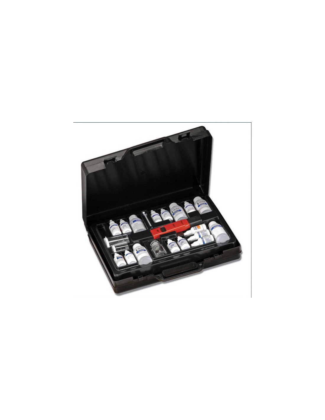 Komplet za testiranje uključuje sve potrebne reagense i pribor za izvođenje preko 100 testova za svaki parametar, elektronički pH tester, čvrsti kovčeg i i upute.