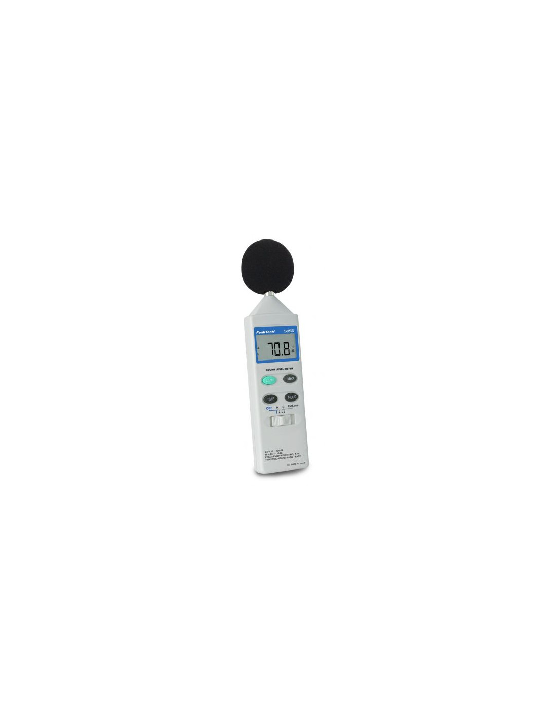 Digitalni mjerač razine zvuka s 3 ½-znamenkastim LCD zaslonom od 17 mm i funkcijskim simbolima nudi ručni odabir raspona u 2 mjerna raspona od 35 ... 100 dB i 65 ... 130 dB s rezolucijom od 0,1 dB. Brzo/sporo prebacivanje, kao i funkcija zadržavanja izmjerene i maksimalne vrijednosti te unutarnji krug za provjeru kalibracije (94 dB).