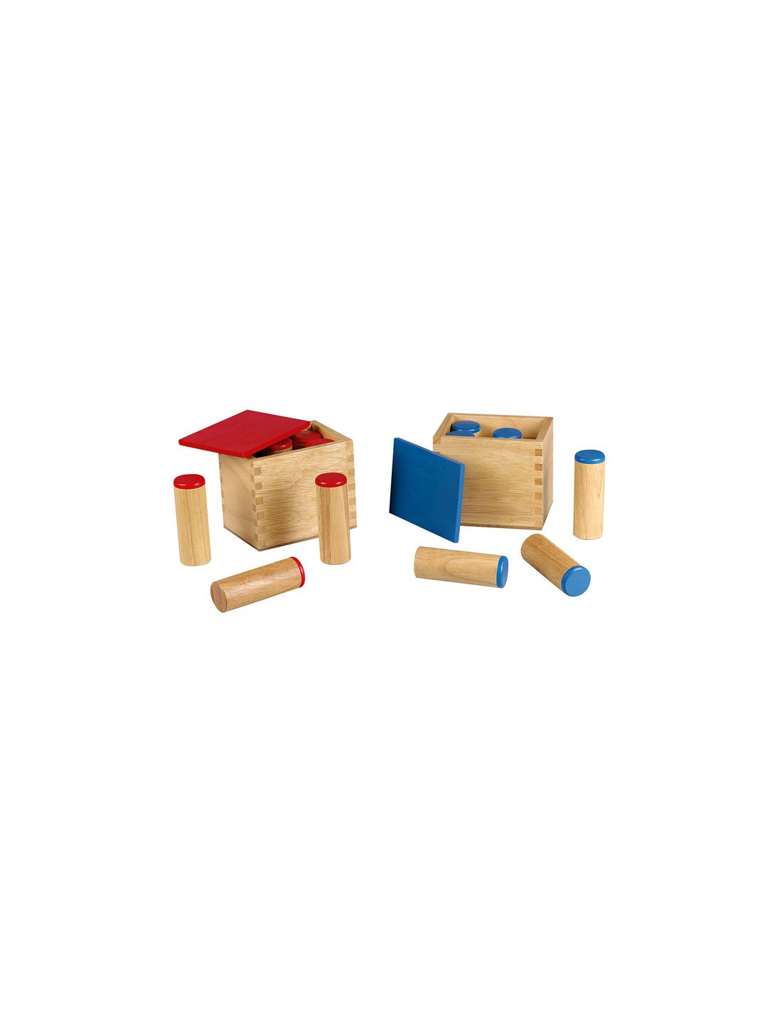 Komplet uključuje 2 drvene kutije s plavim i crvenim poklopcem. U svakoj kutiji se nalazi 6 zvučnih valjaka s poklopcima u plavoj i crvenoj boji. Valjci su ispunjeni različitim materijalima koji proizvode drugačiji zvuk. Promjer valjka 3 cm, visine 9 cm. Dimenzije kutije 8x11x10 cm.