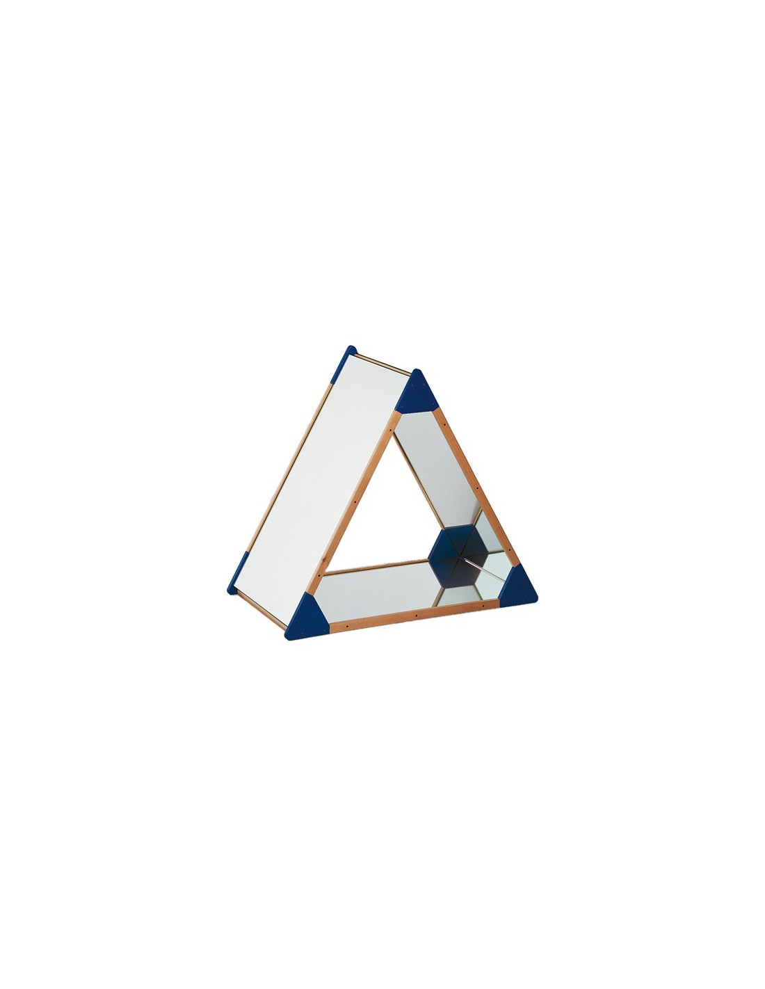 Tri drvene ploče obložene sigurnosnim ogledalima, spojene u oblik trokuta. Sa zaobljenim drvenim uglovima u boji. Dim. 119x103x59cm.
