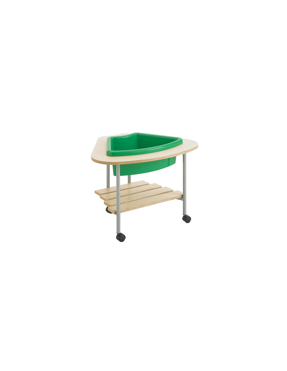 Ovaj pokretni stol u koji se stavlja plitica može služiti za razne namjene - za igre pijeskom i vodom, za skupljanje materijala iz prirode (lišće, grančice, oblutci...), za pijesak za modeliranje (npr. Kinetic Sand, Bubber ili Shape It), za likovni pribor ili pribor za igre vodom... Gornja ploča je premazana vodootpornim premazom. Vrlo je lagan i lako se može premiještati. Kotačići se mogu zakočiti. Pliticu naručite odvojeno. Ovaj stol možete kombinirati s kvadratnim stolom.