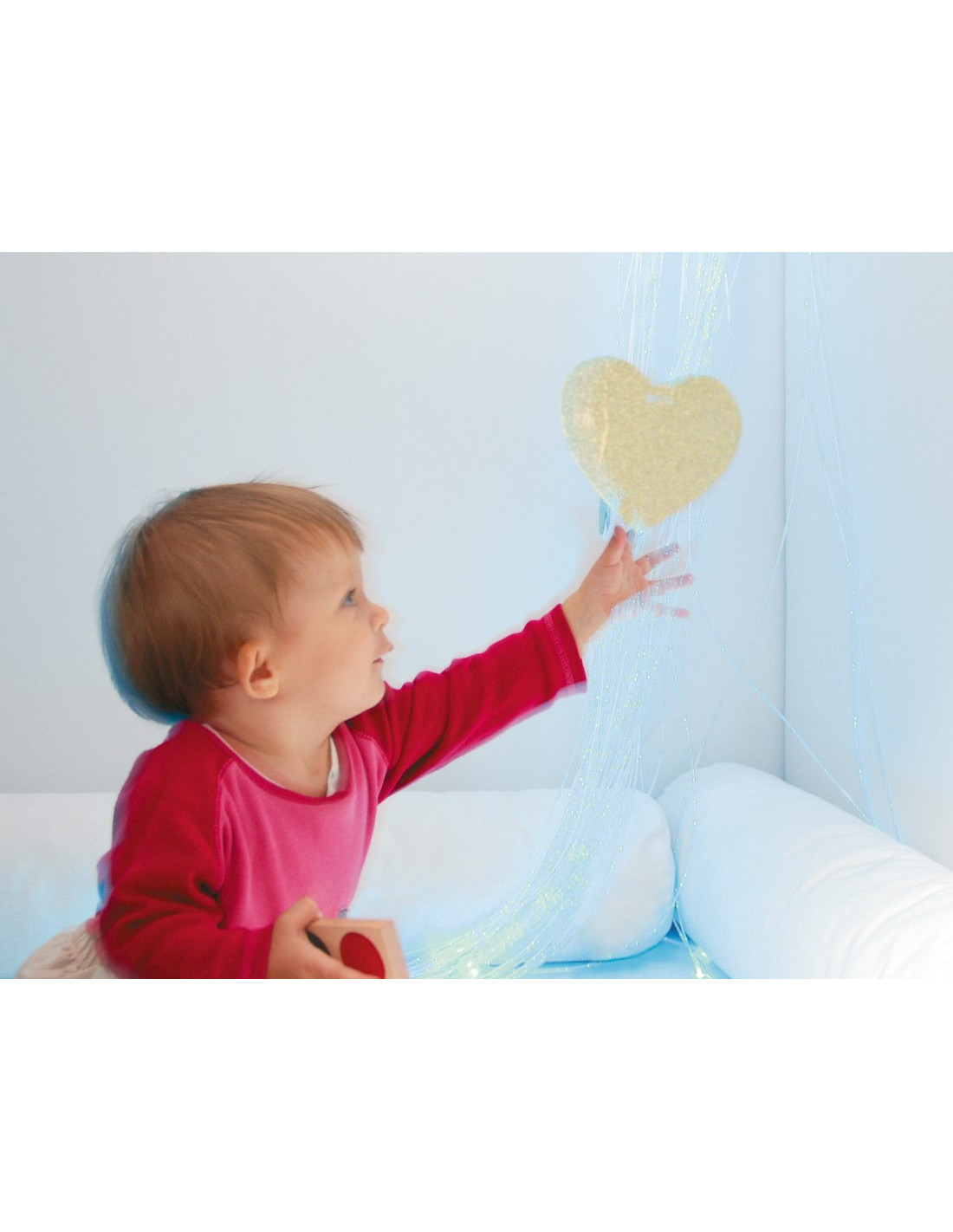 1 okrugla, drvena ploča promjera 20 cm s bojanim utorima, te 7 drvenih oblika različitih boja i ispuna, promjera 4,5 cm, vis. 4 cm (cvijet, srce, kotač, heksagon, prsten, list, kapljica). Oblici proizvode različite zvukove prilikom pomicanja.
